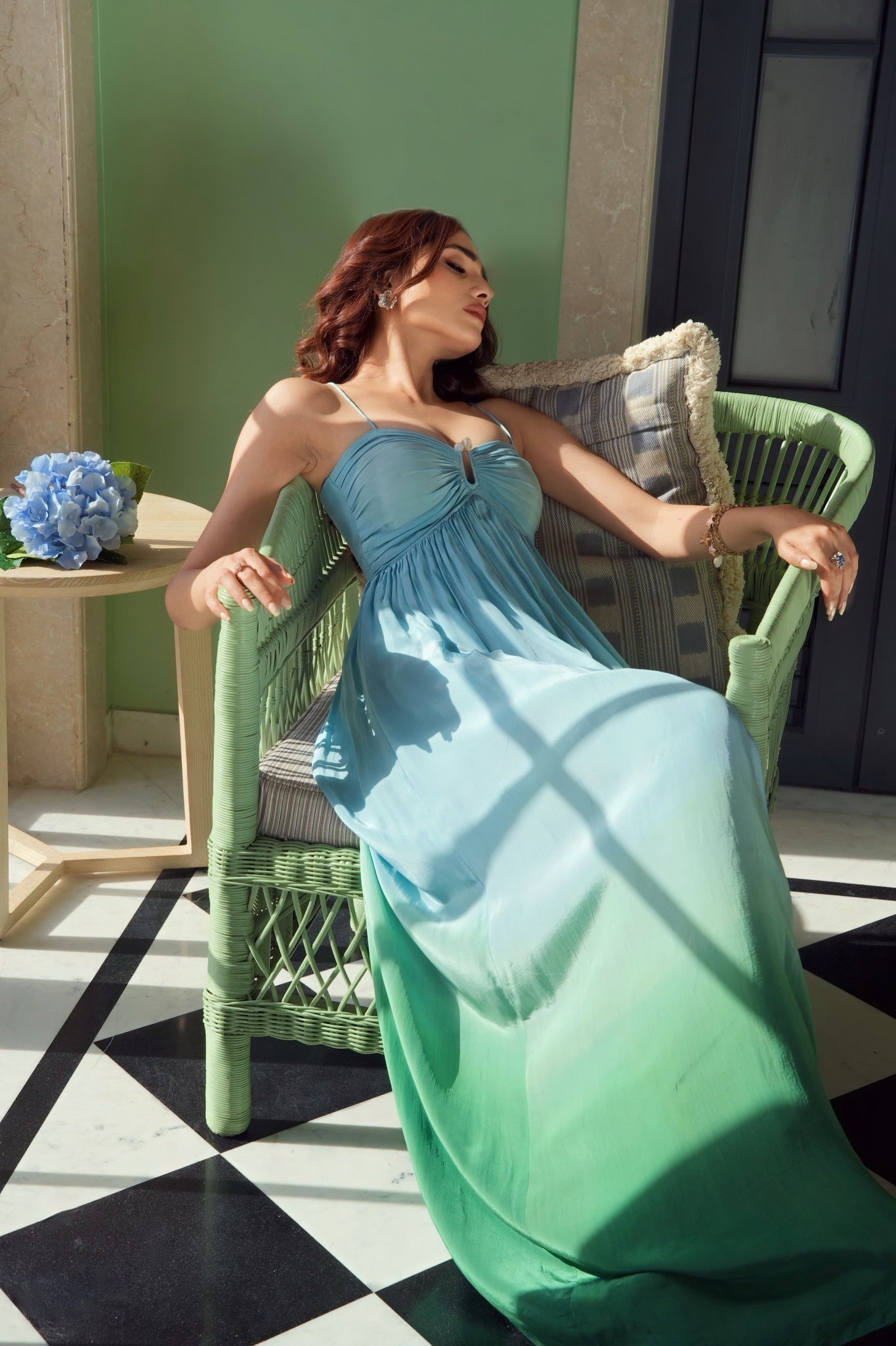 Mallorca is an ombré crepe gown that flows from sky blue to green, evoking the serene beauty of coastal horizons. With delicate noodle straps and subtle embellishments at the bust, it’s a relaxed yet refined choice for daytime events and vacation days.